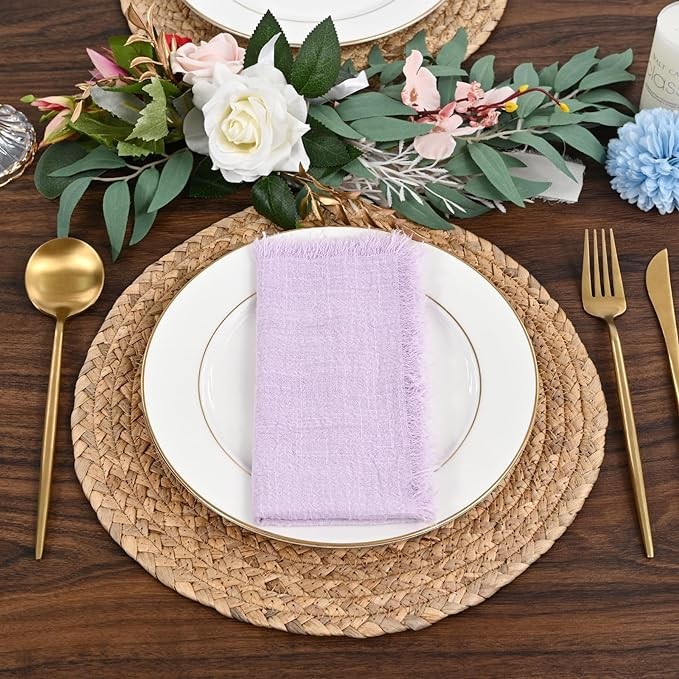 ?️Napkins Features: Handmade lilac napkins feature a delicate tassel design, edges on all four sides are carefully hand-pulled for an elegant 0.5" fringe, not easy to break and knot, Practical with added elegance, purple napkins always can improve the guest experience very well, making the meal more enjoyable.