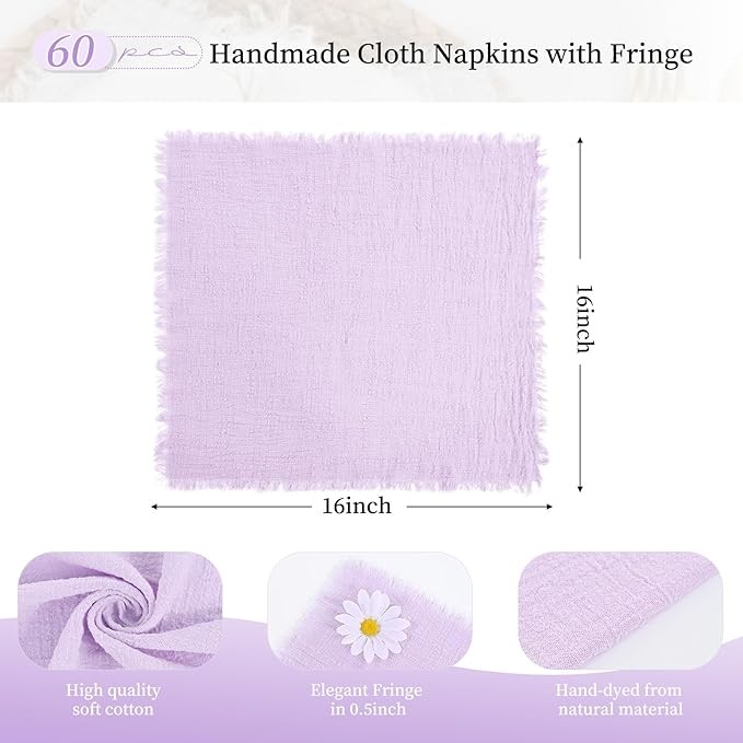 ?️Cloth Napkins Package: you will receive handmade cloth napkins with fringe set of 60, linen napkins bulk, each piece is 16"x16". Lavender napkins can nicely matched with the well-appointed venue, adding a rustic and vintage look to your dinner table.