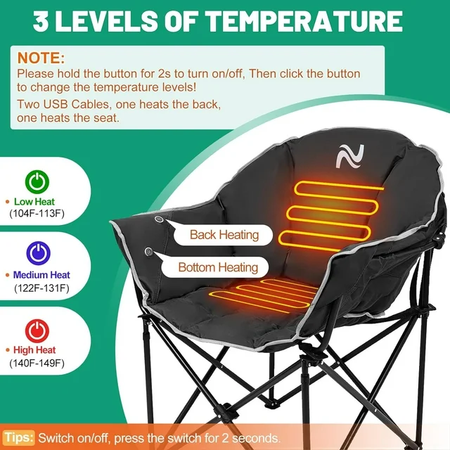 Heat System: The battery heated camping chair quickly warms up both your back and seat (???????? ?????????????? ??????????). Featured with 3 different Heat Mode [Green Light (Low)/Blue Light (Medium)/Red Light (High)] up to 131℉/55℃ that can keep you warm for hours during the cold season.