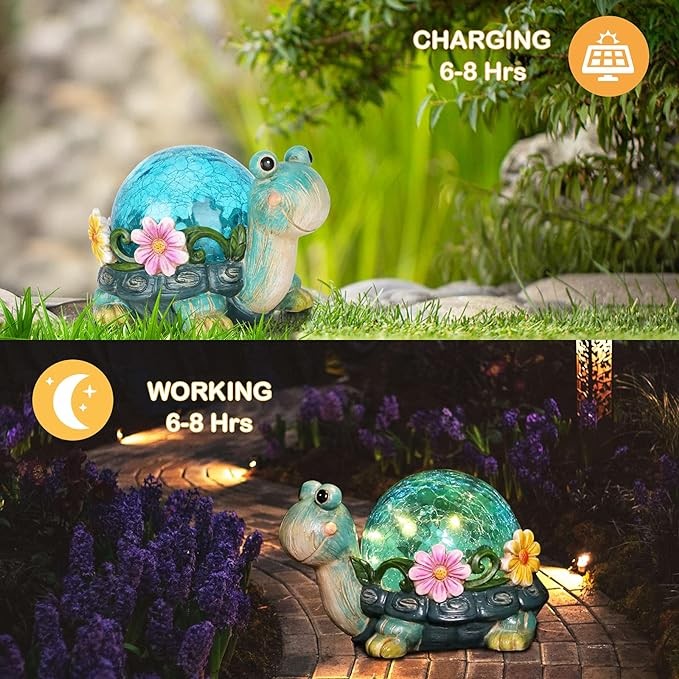 • This adorable turtle garden statue is a wonderful addition to the beauty of any backyard or garden. Plant this solar garden statue to garden, trees, flowers, flowerbed, fence, walkway or anywhere you want.