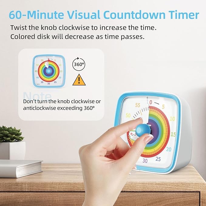 • Easy to Set Time: Just twist the knob at clockwise that you can set the time you need. And you just wait for the disk to disappear. For Kids, it is easy for them to set time and view the time disappearing intuitively.
