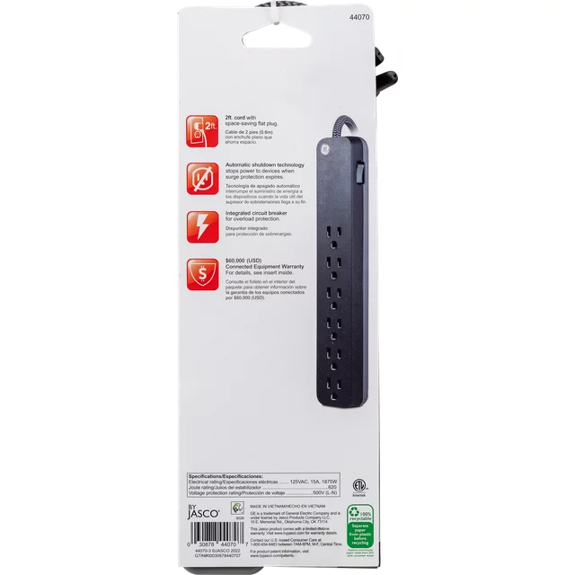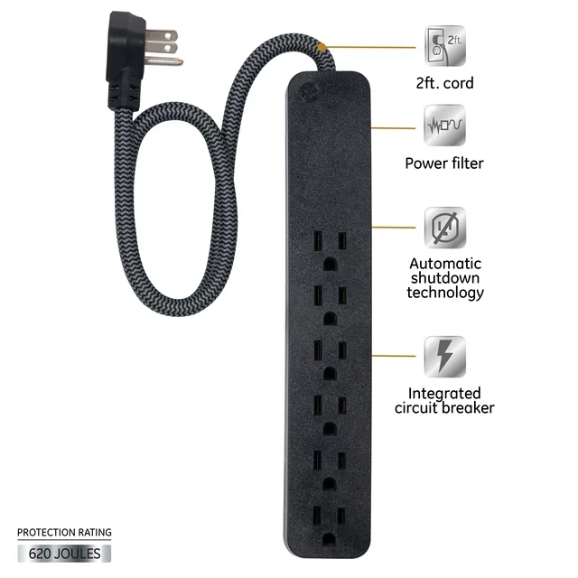 Style meets functionality with the GE Pro Black 6-Outlet Surge Protector. With six grounded outlets and a 2ft. extension cord, power your electronics from a distance. The braided fabric cord reduces tangles, while the low-profile flat plug saves space. The integrated circuit breaker cuts off electricity if it exceeds the maximum amperage, and automatic shutdown technology protects against expired surge protection. With 620 Joules of built-in surge protection, your equipment stays safe. Choose the GE Pro Black 6-Outlet Surge Protector for a stylish and reliable design.
