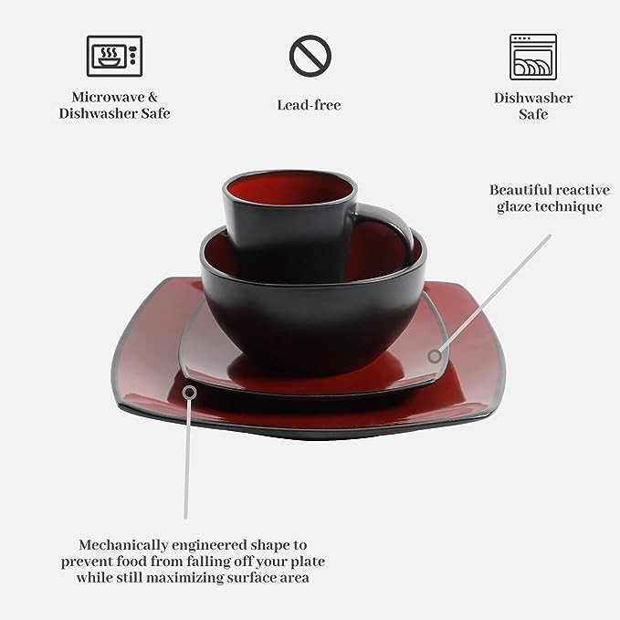 Gibson Soho Lounge Square Reactive Glaze Dinnerware Set, Red, Service for 4 (16pcs)