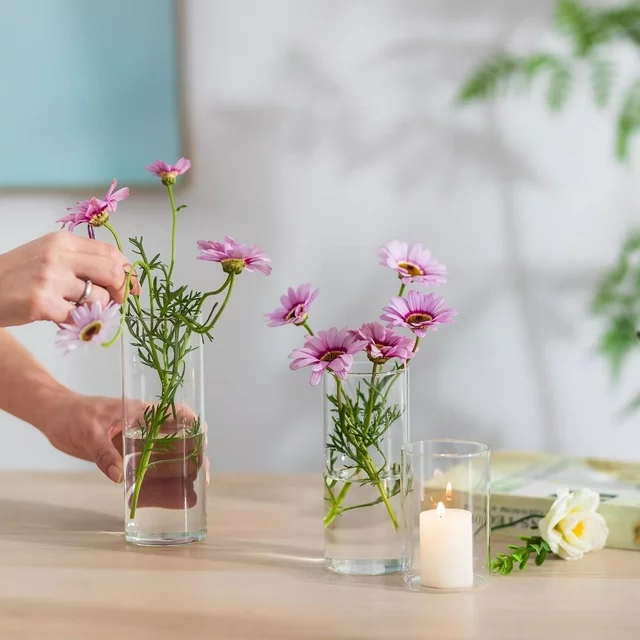 The package includes 6 glass cylinder vases of 3 different heights, 2 pcs each, flowers and candles are not included.