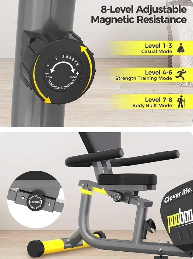 • ?Super Quiet & Smooth 8 Level Magnetic Resistance? Merely no maintenance required. Magnetic needs no brake pad, belt drive system can give you an unbelievably smooth and quiet ride. The rotary tension knob is convenient to customize your workout levels.