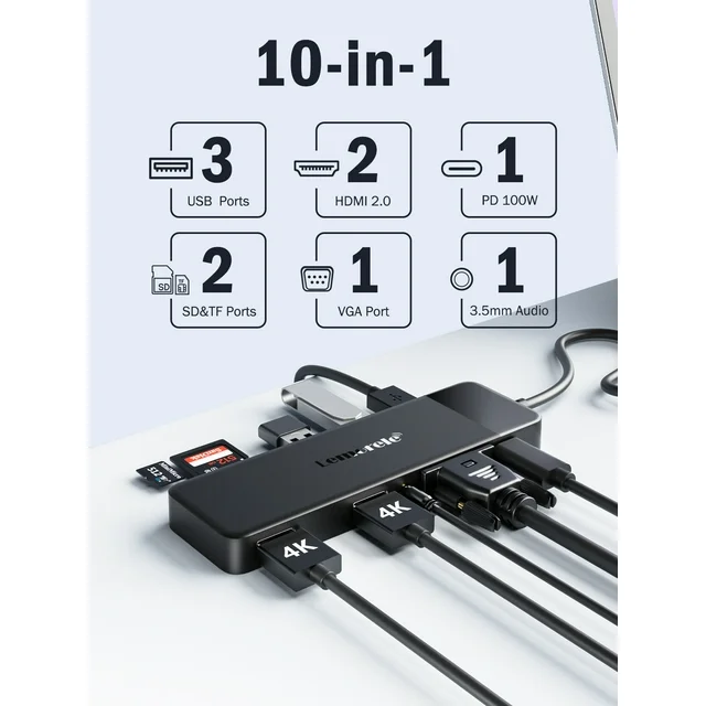 Lemorele 10-in-1 USB C Hub USB C Adapter with 4K 2 HDMI Ports VGA Output 100W Power Delivery