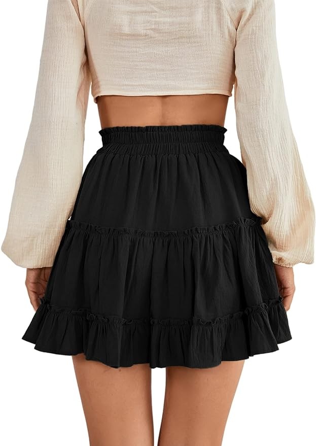 • Solid color, smock elastic waist, pleated, layer ruffle hem, plain flowy short skirt for women and girls.