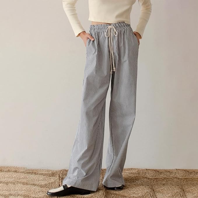 • Spring fall pop pants bottoms for women, elastic high waist and drawstring, with two side pockets, wide leg straight long pants, striped linen pants, blue and white striped pants, casual striped wide leg pants, pj pants y2k, loose stripe long pants.