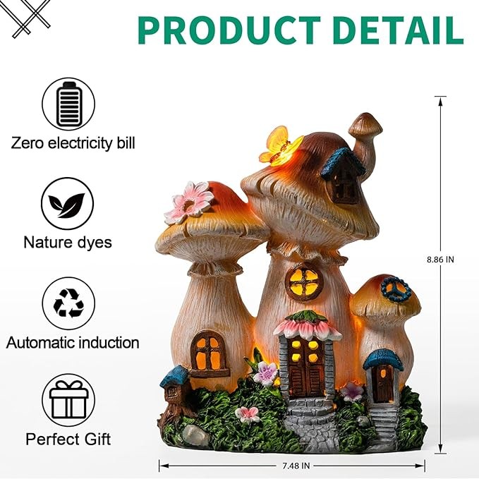 • Weather-Resistant: Each solar Mushroom Garden Statue is hand-painted vibrant colors with great details. Every part is made of long-lasting resin, hand painted with UV resistant paint, making it solid and lasting. no worries about rain, snow, frost, sleet.Perfect for your garden。