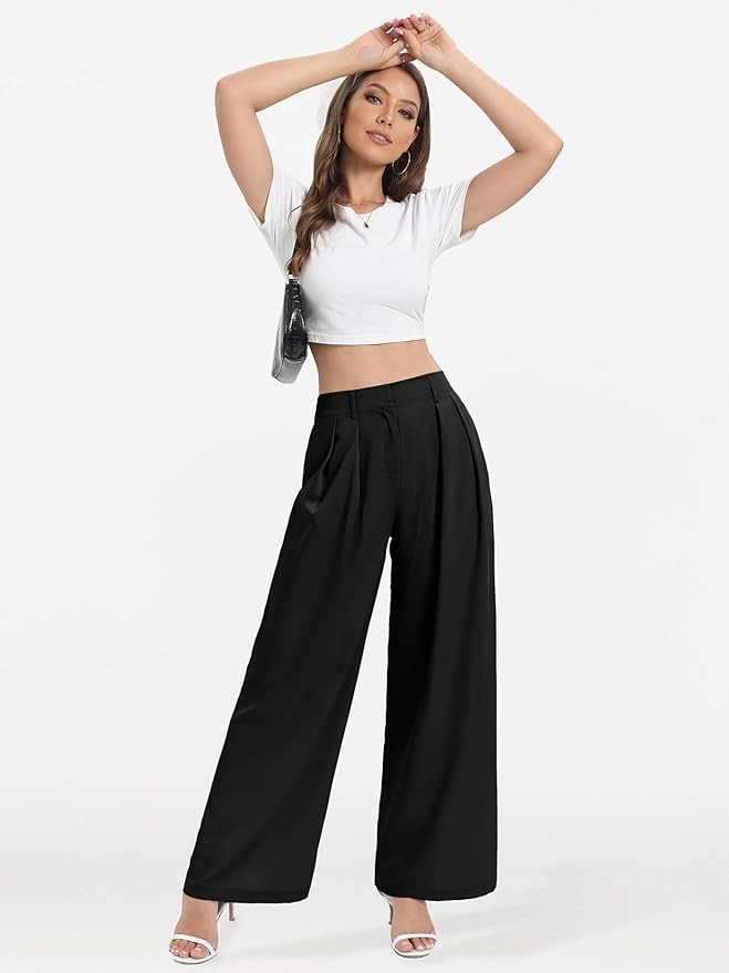 STYLISH & UNIQUE DESIGN: Womens high waist wide leg trousers pants features a zip closure with hook and eye in the front, elastic back, drape design, easy to put on and take off. The front pleats add a fashion sense. The loose flowy wide leg palazzo pants can make you look more atmospheric, modify the imperfect leg shape, and hide the belly fat, making the body looks very slim. Two side pockets are deep enough to hold your phone and wallet, free your hands.