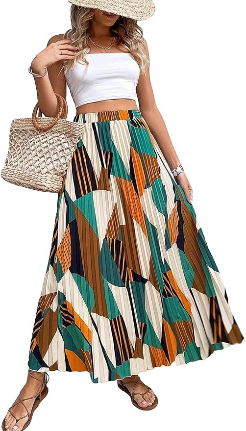 • Design: Geo print, elastic wasit, pleated skirt, maxi skirt, boho style