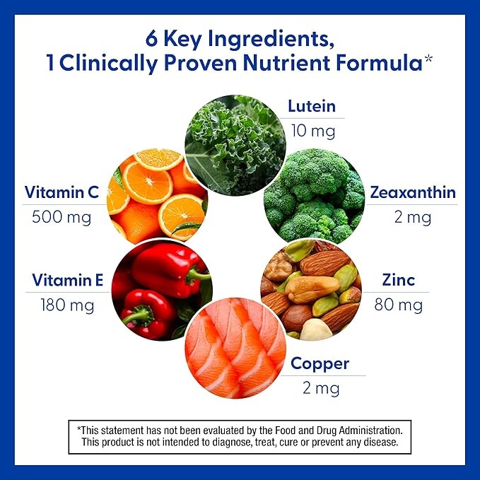 • RECOMMENDED FORMULA: This formula includes lutein, zeaxanthin, zinc, copper, vitamin C, and vitamin E to exactly match the nutrient formula recommended by the AMD experts at the National Eye Institute based on the Age Related Eye Disease Study 2 to help reduce the risk of moderate to advanced AMD progression.