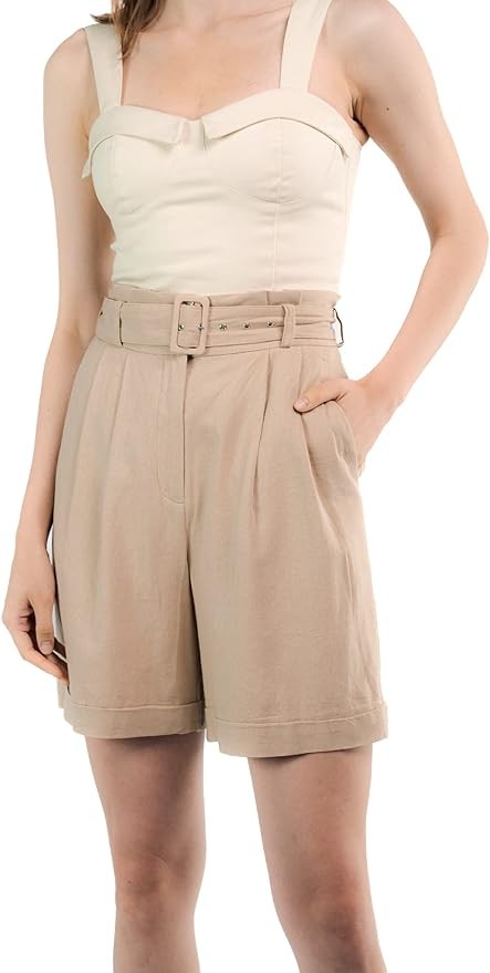 SANDY & SID Womens Shorts 6 Inch Inseam Linen High Rise Adjustable Belt Wide Leg Pockets Summer Casual Work Office