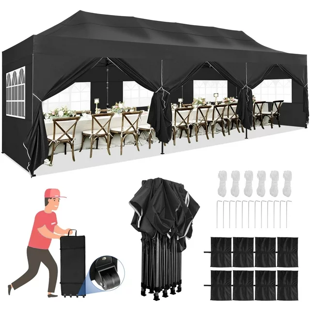 SANOPY 10'x30' Canopy Heavy Duty Pop up Canopy Tent Outdoor Gazebo Shelter Portable Instant Commercial Wedding Party Tent with 8 Removable Sidewalls&3 Heigh Adjustable&Roller Bag,Black