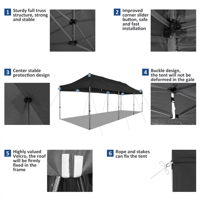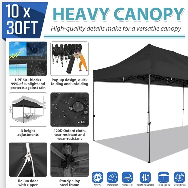 ?【Pop Up Easy Installation Canopy】: The 10x30 instant pop up gazebo tent can be quickly set up and taken down in half an hour. Equipped with detailed instructions and tutorials, two people can assemble or disassemble this canopy in half an hour without any tools, making it very convenient.