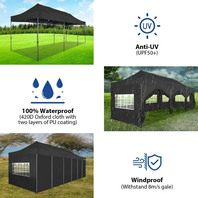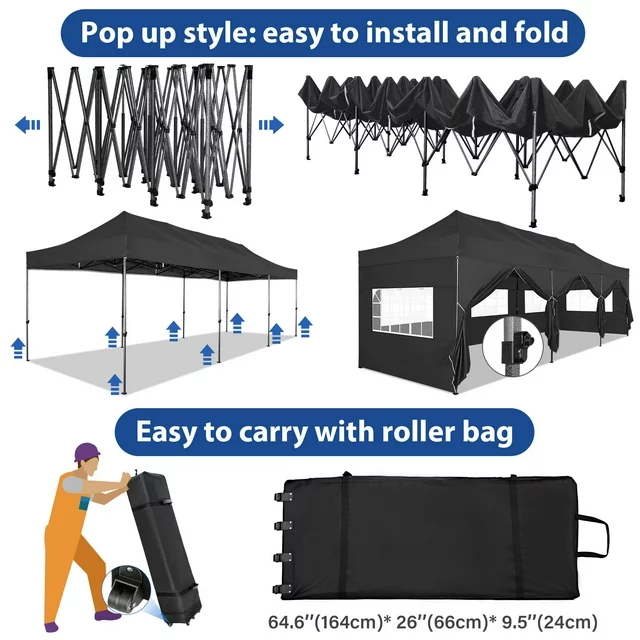 10x30 feet shade area ? Heavy-duty frame is strong and stable ? Pop-up design for quick installation ? 8 side walls in various shapes ? 3 height adjustments ? A full set of rich accessories ? Suitable for all seasons