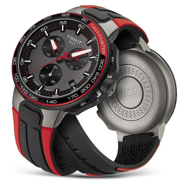 Black dial enhanced by black hands. Grey and Black PVD stainless steel case with a black and red silicone band. Quartz movement. 100 meters / 330 feet water resistance. Fixed bezel. Scratch Resistant Sapphire crystal. Solid caseback. Tang clasp. Pull / Push crown. Case size 45 mm x 11 mm. Band 18 mm x long. Tissot T111.417.37.441.01 T-Race Watch.