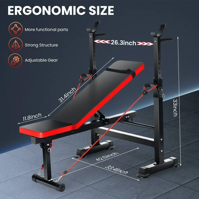• 4 in 1-Piece Set Multifunctional Exercise Equipment - Designed for versatility. Includes 1 VIBESPARK Olympic Weight Bench, and 1 Weight Lifting Rack for full body strength training, such as Flat Bench Presses/Incline Dumbbell Bench Press/One-Arm Dumbbell Preacher Curl, etc. With two pull-up grips to exercise arm muscles, the supine board allows you to exercise abdominal and leg muscles. You would also get 2 resistance bands as attachments, the bands will be a great assistant for your effective fitness or weight loss programs, no matter if you are a beginner or an expert, the bands will meet your needs.