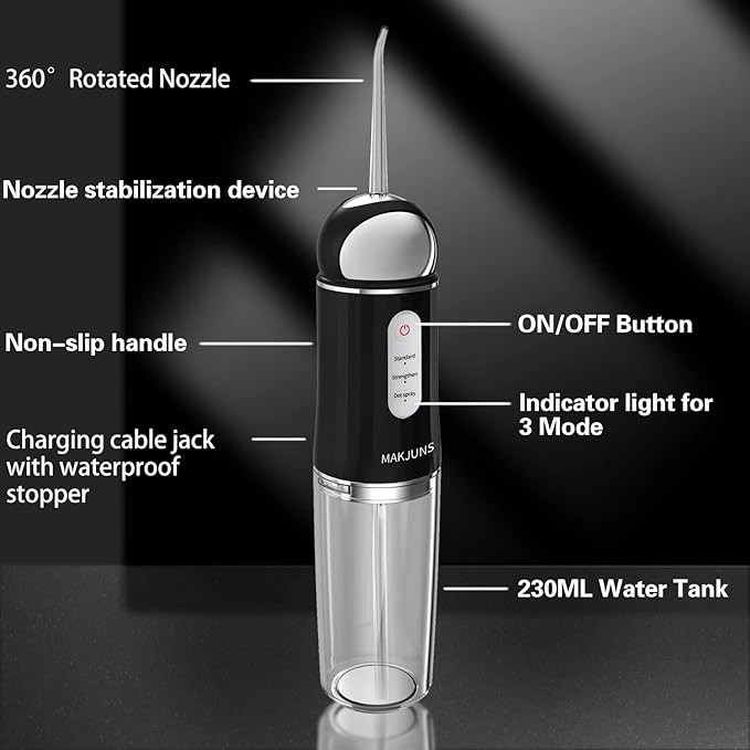 • 【3 Modes 4 Jets】MAKJUNS water dental flosser is available in normal, soft and pulse modes. It has 4 interchangeable nozzles to meet the needs of more teeth.