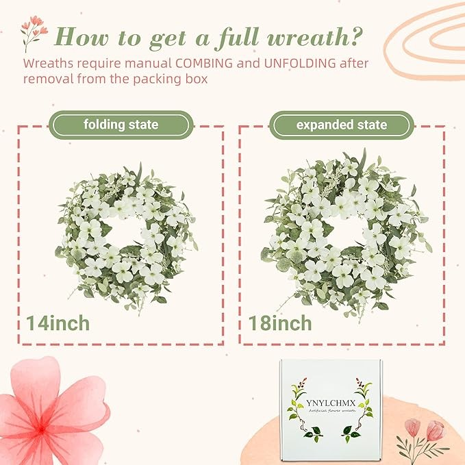 • [WREATH INSTRUCTIONS]: To prevent damages caused during transportation, our artificial wreaths will be packed and fastened in a box. Please unfold and expand it to its full size and get the best look