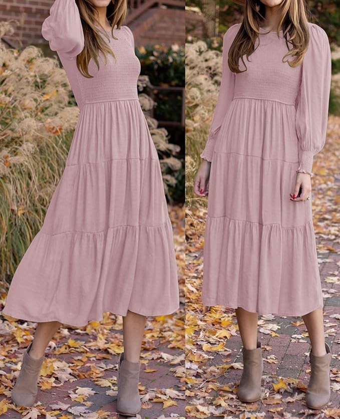 ZESICA Women's 2024 Casual Long Sleeve Crew Neck High Waist Smocked Flowy Tiered Midi Dress